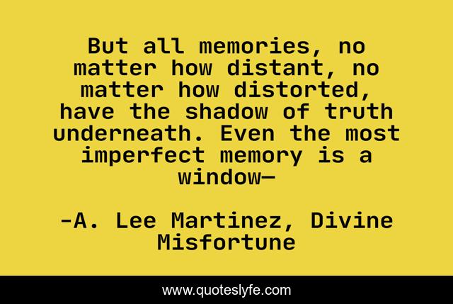 This page presents the quote "But all memories, no matter how distant, no matter how distorted, have the shadow of truth underneath. Even the most imperfect memory is a window—". Author of this quote is A. Lee Martinez, Divine Misfortune. This quote is about memories, truth,.