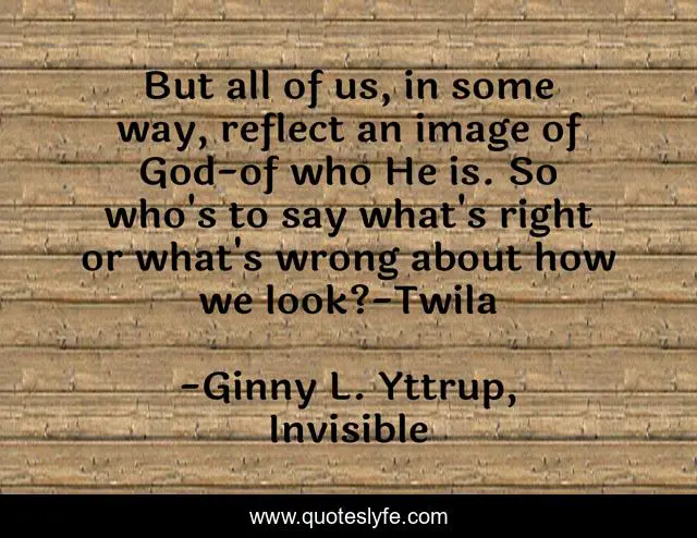 This page presents the quote "But all of us, in some way, reflect an image of God-of who He is. So who's to say what's right or what's wrong about how we look?-Twila". Author of this quote is Ginny L. Yttrup, Invisible. .