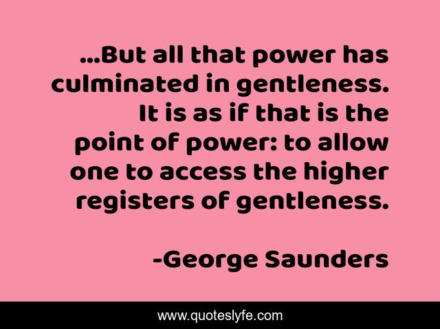 This page presents the quote "...But all that power has culminated in gentleness. It is as if that is the point of power: to allow one to access the higher registers of gentleness.". Author of this quote is George Saunders. .