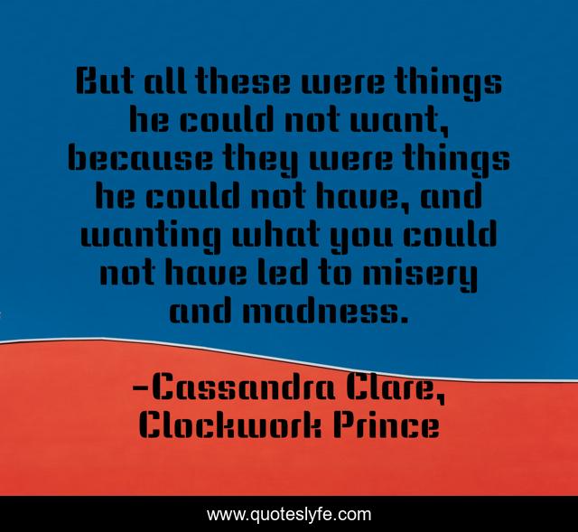 This page presents the quote "But all these were things he could not want, because they were things he could not have, and wanting what you could not have led to misery and madness.". Author of this quote is Cassandra Clare, Clockwork Prince. This quote is about wanting, misery,.
