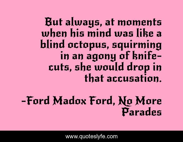 This page presents the quote "But always, at moments when his mind was like a blind octopus, squirming in an agony of knife-cuts, she would drop in that accusation.". Author of this quote is Ford Madox Ford, No More Parades. This quote is about accusation, mind, parade-s-end, octopus, no-more-parades,.