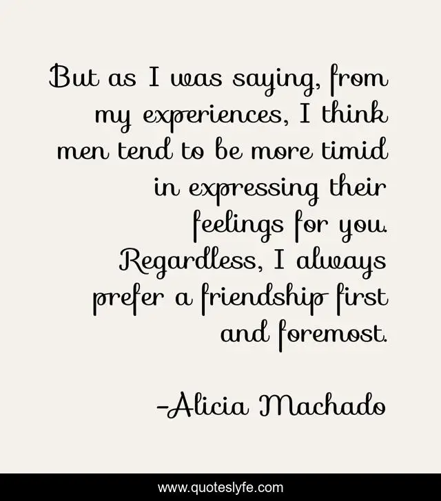 This page presents the quote "But as I was saying, from my experiences, I think men tend to be more timid in expressing their feelings for you. Regardless, I always prefer a friendship first and foremost.". Author of this quote is Alicia Machado. This quote is about saying, men, think,.