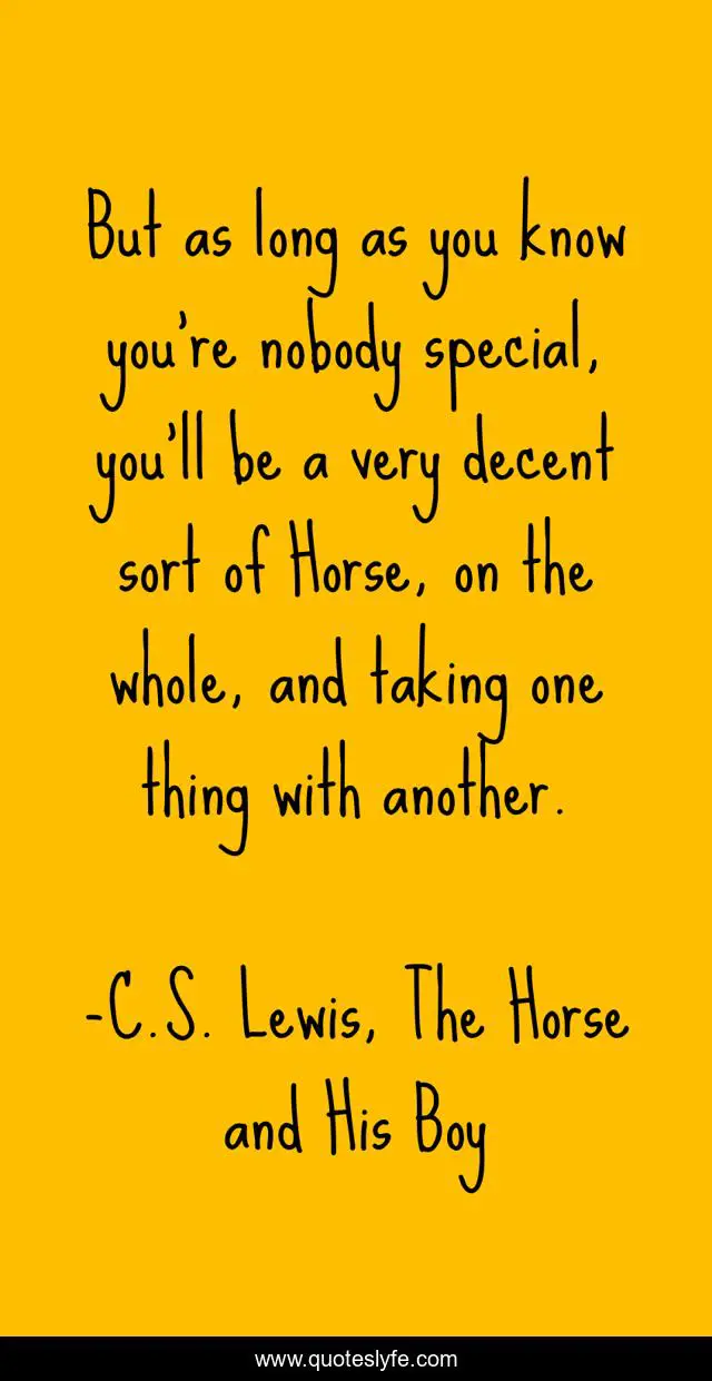 This page presents the quote "But as long as you know you're nobody special, you'll be a very decent sort of Horse, on the whole, and taking one thing with another.". Author of this quote is C.S. Lewis, The Horse and His Boy. .