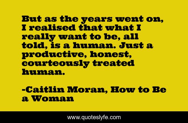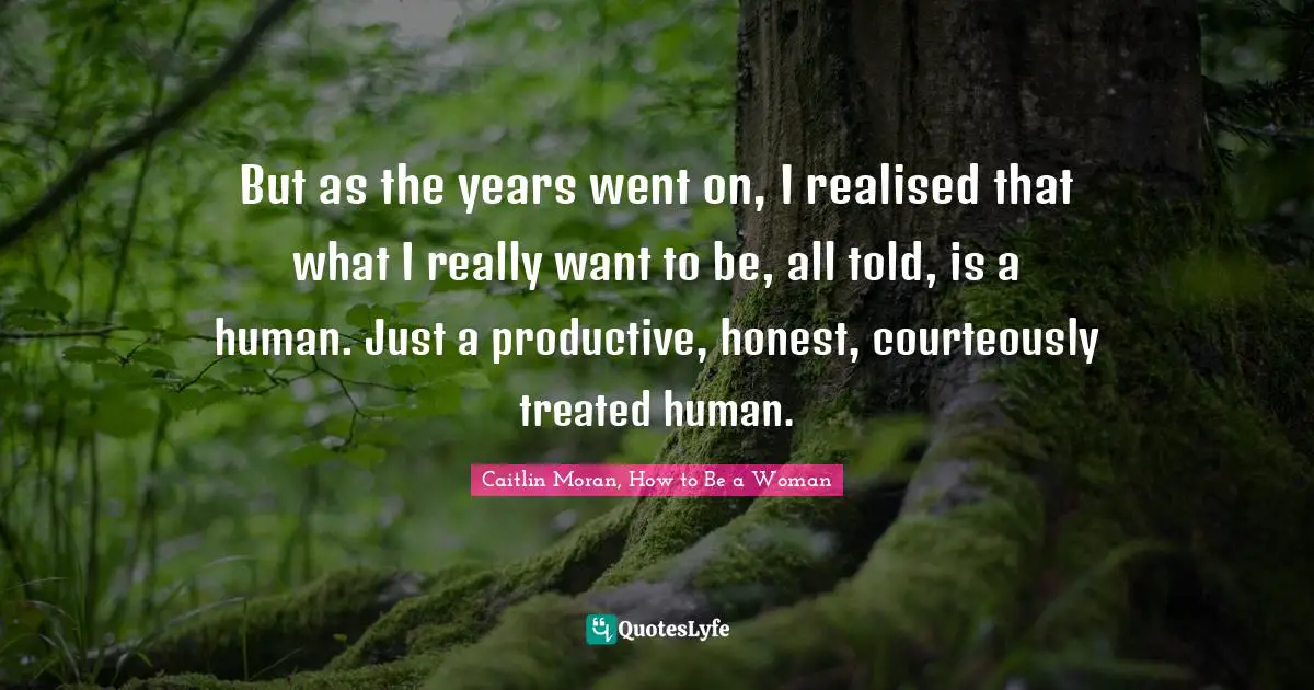 This page presents the quote "But as the years went on, I realised that what I really want to be, all told, is a human. Just a productive, honest, courteously treated human.". Author of this quote is Caitlin Moran, How to Be a Woman. This quote is about enthusiasm, inspirational, feminist,.