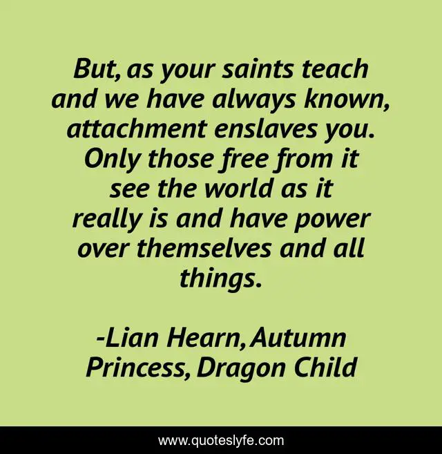 This page presents the quote "But, as your saints teach and we have always known, attachment enslaves you. Only those free from it see the world as it really is and have power over themselves and all things.". Author of this quote is Lian Hearn, Autumn Princess, Dragon Child. This quote is about freedom, love, attachment, affection,.