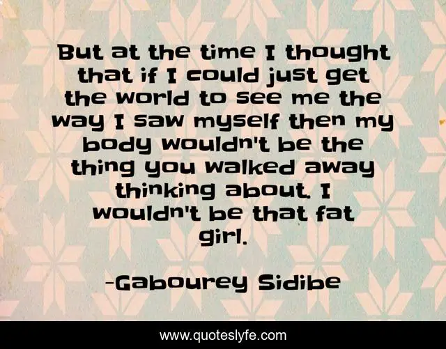 This page presents the quote "But at the time I thought that if I could just get the world to see me the way I saw myself then my body wouldn't be the thing you walked away thinking about. I wouldn't be that fat girl.". Author of this quote is Gabourey Sidibe. This quote is about funny, comedy, biography,.