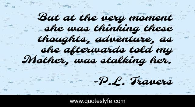 This page presents the quote "But at the very moment she was thinking these thoughts, adventure, as she afterwards told my Mother, was stalking her.". Author of this quote is P.L. Travers. This quote is about marry-poppins, travers, adventure, stalking,.