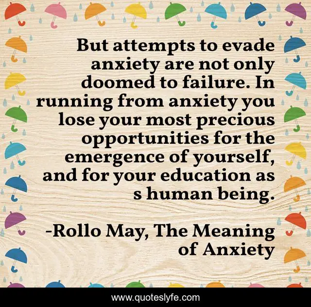 This page presents the quote "But attempts to evade anxiety are not only doomed to failure. In running from anxiety you lose your most precious opportunities for the emergence of yourself, and for your education as s human being.". Author of this quote is Rollo May, The Meaning of Anxiety. This quote is about anxiety, human,.