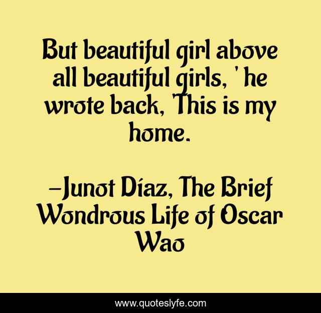This page presents the quote "But beautiful girl above all beautiful girls, ' he wrote back, 'This is my home.". Author of this quote is Junot Díaz, The Brief Wondrous Life of Oscar Wao. This quote is about beautiful, home, girl, love, affection,.
