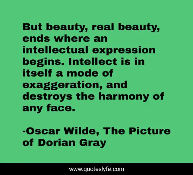 This page presents the quote "But beauty, real beauty, ends where an intellectual expression begins. Intellect is in itself a mode of exaggeration, and destroys the harmony of any face.". Author of this quote is Oscar Wilde, The Picture of Dorian Gray. .