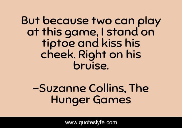 This page presents the quote "But because two can play at this game, I stand on tiptoe and kiss his cheek. Right on his bruise.". Author of this quote is Suzanne Collins, The Hunger Games. This quote is about awesome, game, kiss,.