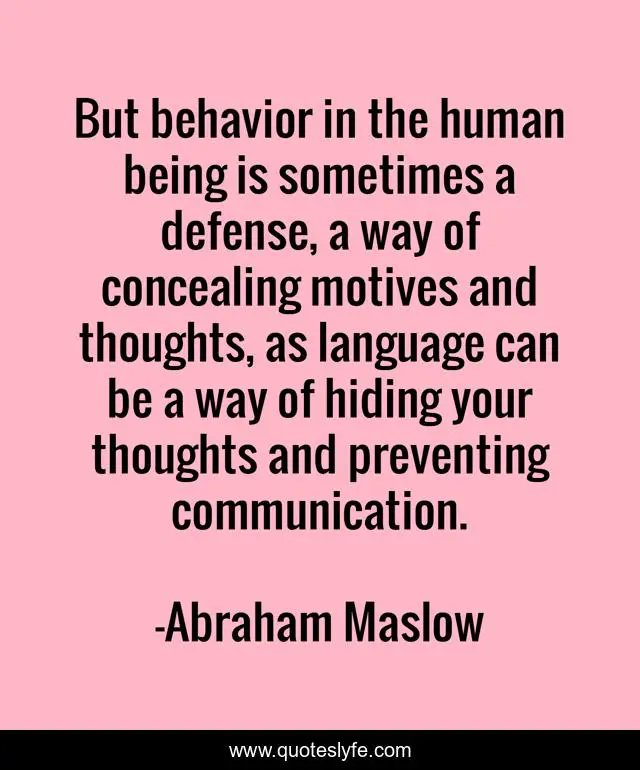 This page presents the quote "But behavior in the human being is sometimes a defense, a way of concealing motives and thoughts, as language can be a way of hiding your thoughts and preventing communication.". Author of this quote is Abraham Maslow. This quote is about thoughts, language, behavior,.
