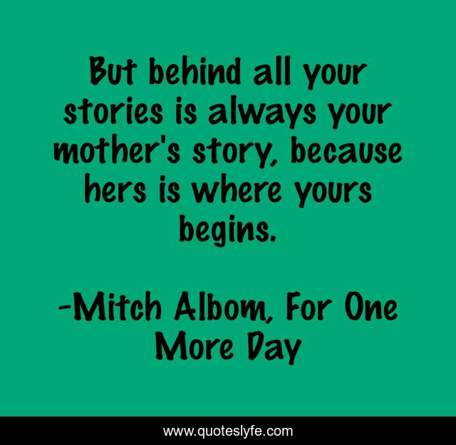 This page presents the quote "But behind all your stories is always your mother's story, because hers is where yours begins.". Author of this quote is Mitch Albom, For One More Day. This quote is about life, mothers-love, mothers,.