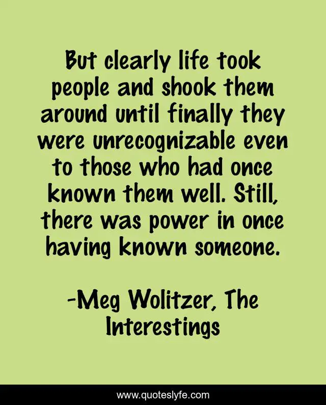 This page presents the quote "But clearly life took people and shook them around until finally they were unrecognizable even to those who had once known them well. Still, there was power in once having known someone.". Author of this quote is Meg Wolitzer, The Interestings. .