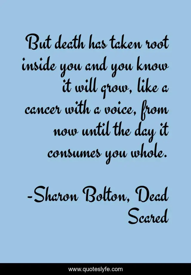 This page presents the quote "But death has taken root inside you and you know it will grow, like a cancer with a voice, from now until the day it consumes you whole.". Author of this quote is Sharon Bolton, Dead Scared. This quote is about crime, death, sj-bolton, thriller, lacey-flint,.