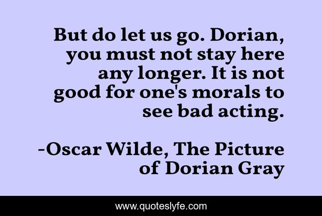This page presents the quote "But do let us go. Dorian, you must not stay here any longer. It is not good for one's morals to see bad acting.". Author of this quote is Oscar Wilde, The Picture of Dorian Gray. This quote is about oscar-wilde, the-picture-of-dorian-gray,.