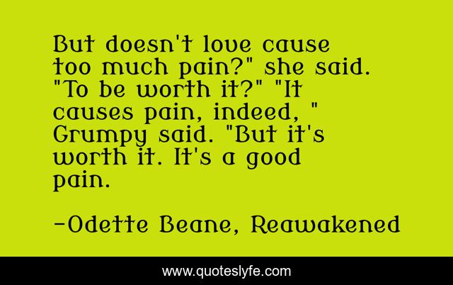 This page presents the quote "But doesn't love cause too much pain?" she said. "To be worth it?" "It causes pain, indeed, " Grumpy said. "But it's worth it. It's a good pain.". Author of this quote is Odette Beane, Reawakened. This quote is about love, pain, affection,.