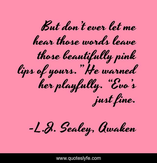 This page presents the quote "But don’t ever let me hear those words leave those beautifully pink lips of yours.” He warned her playfully. “Evo’s just fine.". Author of this quote is L.J. Sealey, Awaken. This quote is about divine-hunter, awaken, supernatural, paranormal-romance, evo,.