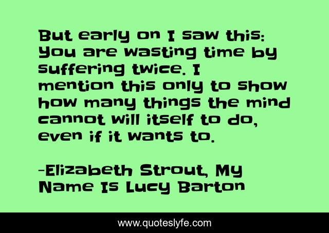This page presents the quote "But early on I saw this: You are wasting time by suffering twice. I mention this only to show how many things the mind cannot will itself to do, even if it wants to.". Author of this quote is Elizabeth Strout, My Name Is Lucy Barton. This quote is about worrying-over-nothing, family-relationships, daughter-mother-relationship, dread,.