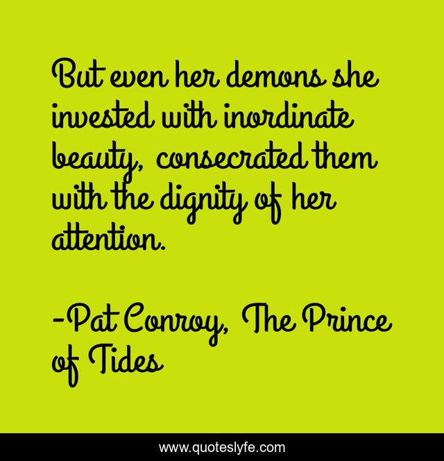 This page presents the quote "But even her demons she invested with inordinate beauty, consecrated them with the dignity of her attention.". Author of this quote is Pat Conroy, The Prince of Tides. .