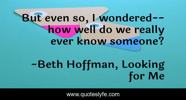 This page presents the quote "But even so, I wondered--how well do we really ever know someone?". Author of this quote is Beth Hoffman, Looking for Me. .