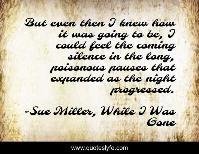 This page presents the quote "But even then I knew how it was going to be, I could feel the coming silence in the long, poisonous pauses that expanded as the night progressed.". Author of this quote is Sue Miller, While I Was Gone. This quote is about anger, relationships, sue-miller, silence, while-i-was-gone,.