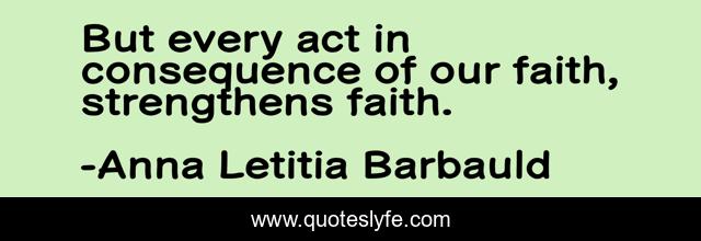 This page presents the quote "But every act in consequence of our faith, strengthens faith.". Author of this quote is Anna Letitia Barbauld. This quote is about consequence, act,.