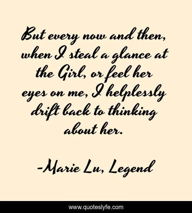 This page presents the quote "But every now and then, when I steal a glance at the Girl, or feel her eyes on me, I helplessly drift back to thinking about her.". Author of this quote is Marie Lu, Legend. This quote is about thinking, girl, june, day,.
