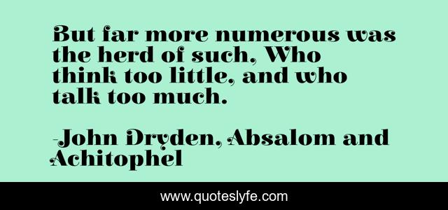 This page presents the quote "But far more numerous was the herd of such, Who think too little, and who talk too much.". Author of this quote is John Dryden, Absalom and Achitophel. This quote is about poetry, loquacity,.