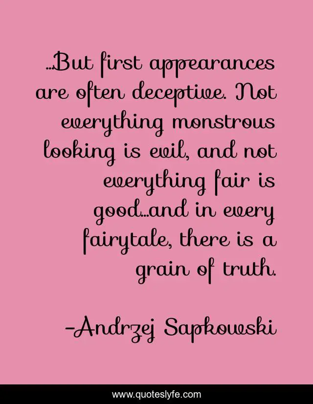 This page presents the quote "...But first appearances are often deceptive. Not everything monstrous looking is evil, and not everything fair is good...and in every fairytale, there is a grain of truth.". Author of this quote is Andrzej Sapkowski. This quote is about fairytale, good, evil,.