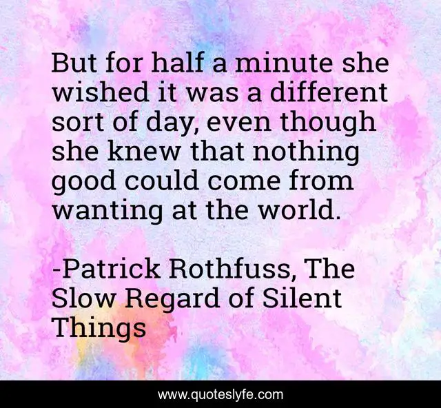 This page presents the quote "But for half a minute she wished it was a different sort of day, even though she knew that nothing good could come from wanting at the world.". Author of this quote is Patrick Rothfuss, The Slow Regard of Silent Things. This quote is about wanting, acceptance, wishing,.