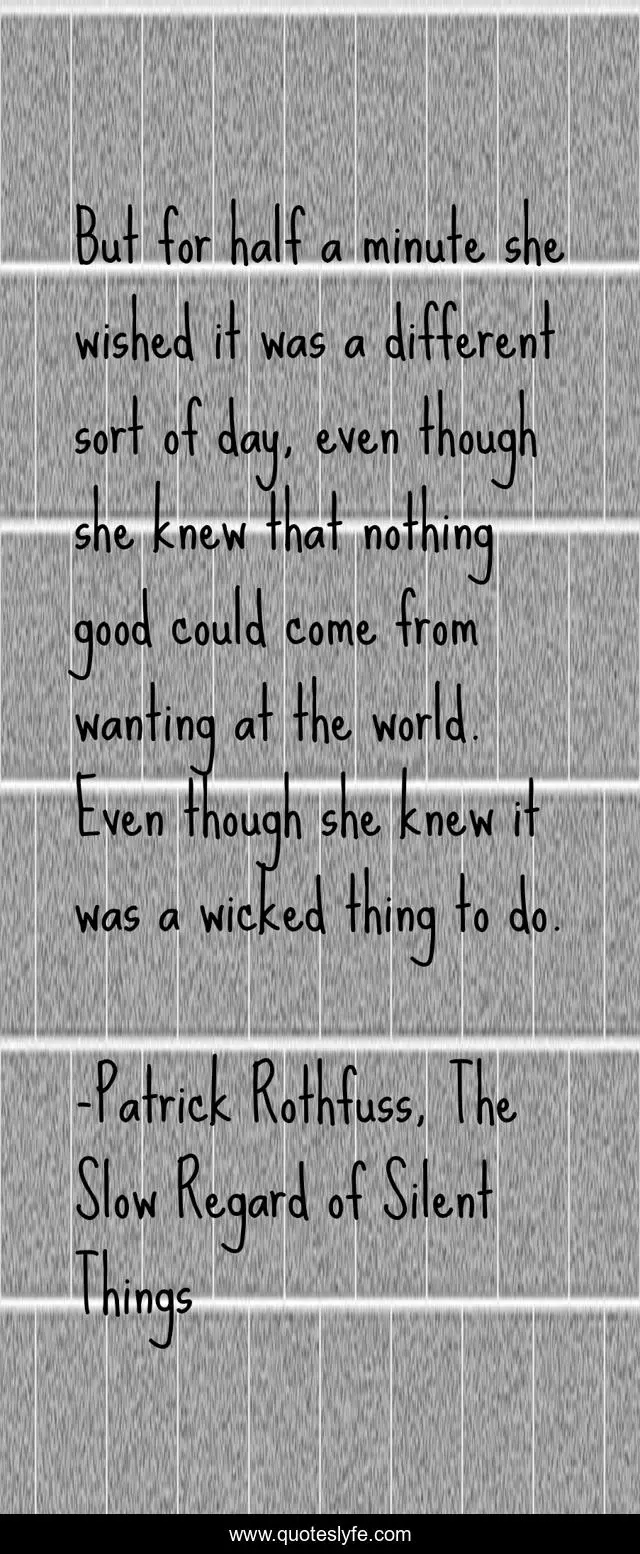 This page presents the quote "But for half a minute she wished it was a different sort of day, even though she knew that nothing good could come from wanting at the world. Even though she knew it was a wicked thing to do.". Author of this quote is Patrick Rothfuss, The Slow Regard of Silent Things. This quote is about patience, auri,.
