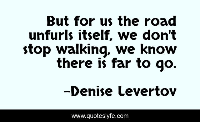 This page presents the quote "But for us the road unfurls itself, we don't stop walking, we know there is far to go.". Author of this quote is Denise Levertov. .