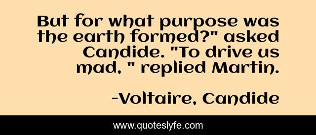This page presents the quote "But for what purpose was the earth formed?" asked Candide. "To drive us mad, " replied Martin.". Author of this quote is Voltaire, Candide. This quote is about world, live,.