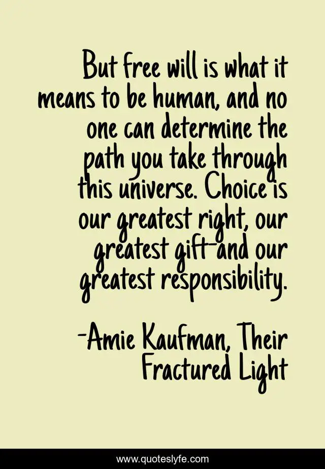 This page presents the quote "But free will is what it means to be human, and no one can determine the path you take through this universe. Choice is our greatest right, our greatest gift-and our greatest responsibility.". Author of this quote is Amie Kaufman, Their Fractured Light. This quote is about free-will, humanity, choice,.