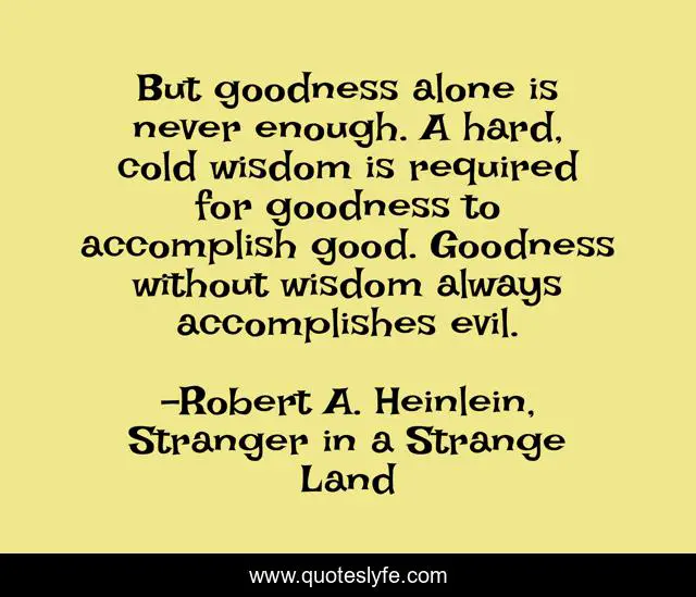 This page presents the quote "But goodness alone is never enough. A hard, cold wisdom is required for goodness to accomplish good. Goodness without wisdom always accomplishes evil.". Author of this quote is Robert A. Heinlein, Stranger in a Strange Land. This quote is about goodness, wisdom,.