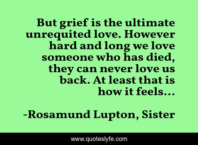 This page presents the quote "But grief is the ultimate unrequited love. However hard and long we love someone who has died, they can never love us back. At least that is how it feels...". Author of this quote is Rosamund Lupton, Sister. .
