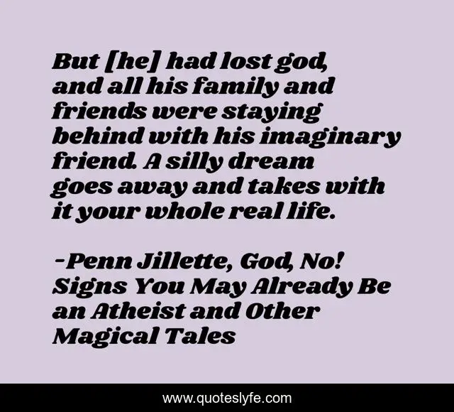 This page presents the quote "But [he] had lost god, and all his family and friends were staying behind with his imaginary friend. A silly dream goes away and takes with it your whole real life.". Author of this quote is Penn Jillette, God, No! Signs You May Already Be an Atheist and Other Magical Tales. This quote is about atheism, religion,.