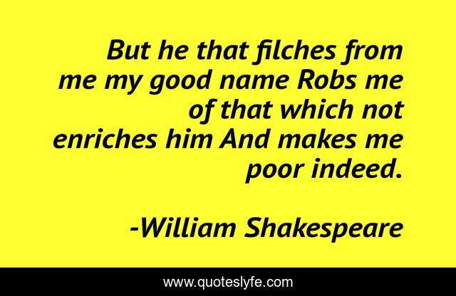 This page presents the quote "But he that filches from me my good name Robs me of that which not enriches him And makes me poor indeed.". Author of this quote is William Shakespeare. .