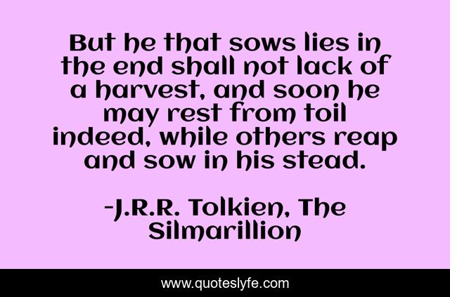 This page presents the quote "But he that sows lies in the end shall not lack of a harvest, and soon he may rest from toil indeed, while others reap and sow in his stead.". Author of this quote is J.R.R. Tolkien, The Silmarillion. This quote is about lies, falsehood, melkor, liars,.