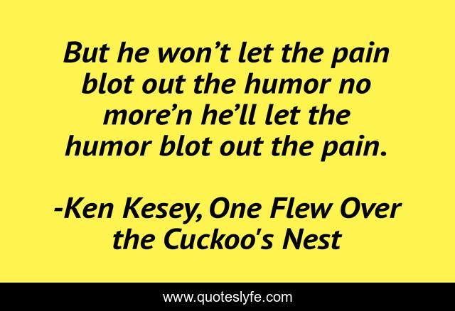 This page presents the quote "But he won’t let the pain blot out the humor no more’n he’ll let the humor blot out the pain.". Author of this quote is Ken Kesey, One Flew Over the Cuckoo's Nest. This quote is about life, pain,.