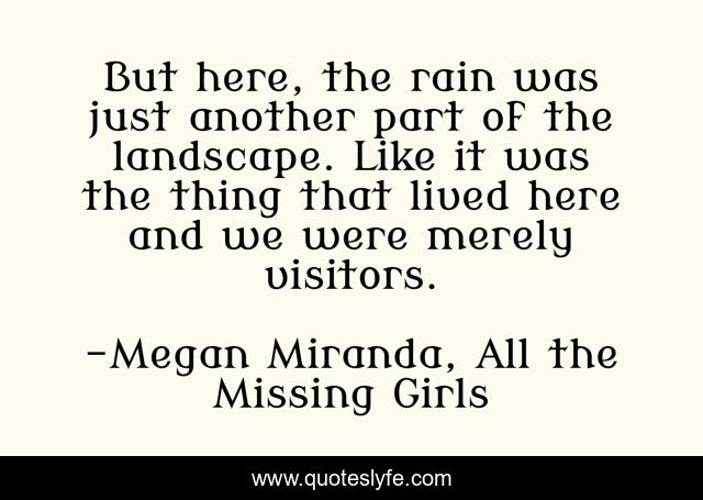 This page presents the quote "But here, the rain was just another part of the landscape. Like it was the thing that lived here and we were merely visitors.". Author of this quote is Megan Miranda, All the Missing Girls. This quote is about home, landscape, rain, all-the-missing-girls,.