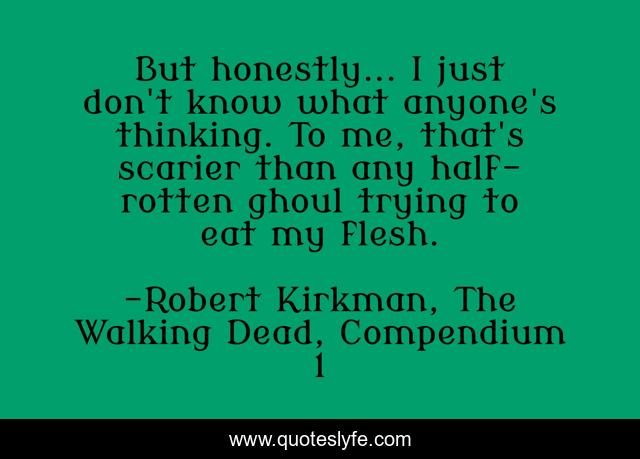 This page presents the quote "But honestly... I just don't know what anyone's thinking. To me, that's scarier than any half-rotten ghoul trying to eat my flesh.". Author of this quote is Robert Kirkman, The Walking Dead, Compendium 1. This quote is about zombie, the-walking-dead, knowledge,.