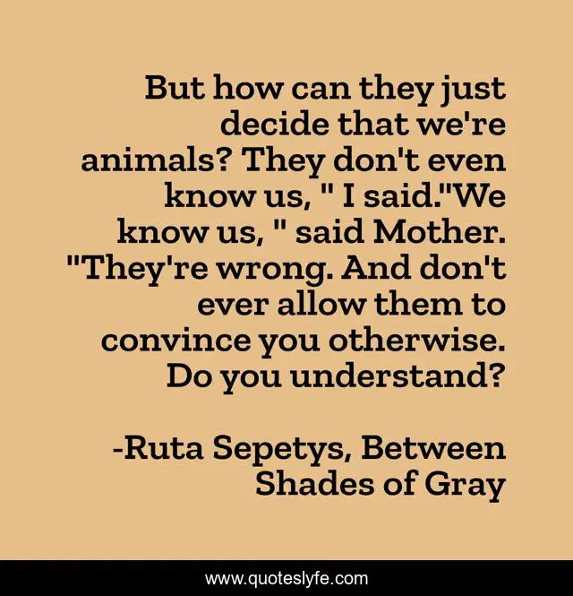 This page presents the quote "But how can they just decide that we're animals? They don't even know us, " I said."We know us, " said Mother. "They're wrong. And don't ever allow them to convince you otherwise. Do you understand?". Author of this quote is Ruta Sepetys, Between Shades of Gray. This quote is about strength-of-character, enthusiasm, strength, strength-through-adversity, inspirational,.