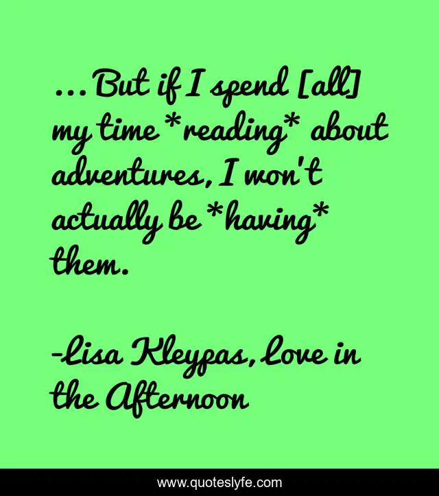 This page presents the quote "... But if I spend [all] my time *reading* about adventures, I won't actually be *having* them.". Author of this quote is Lisa Kleypas, Love in the Afternoon. This quote is about life, life-lessons, positive, motivational, adventurer, confidence, adventure, inspirational, enthusiasm,.