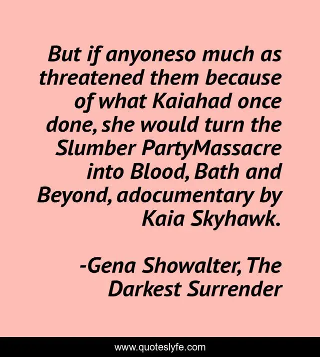 This page presents the quote "But if anyoneso much as threatened them because of what Kaiahad once done, she would turn the Slumber PartyMassacre into Blood, Bath and Beyond, adocumentary by Kaia Skyhawk.". Author of this quote is Gena Showalter, The Darkest Surrender. .