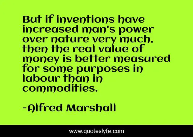 This page presents the quote "But if inventions have increased man's power over nature very much, then the real value of money is better measured for some purposes in labour than in commodities.". Author of this quote is Alfred Marshall. This quote is about nature, power, man,.
