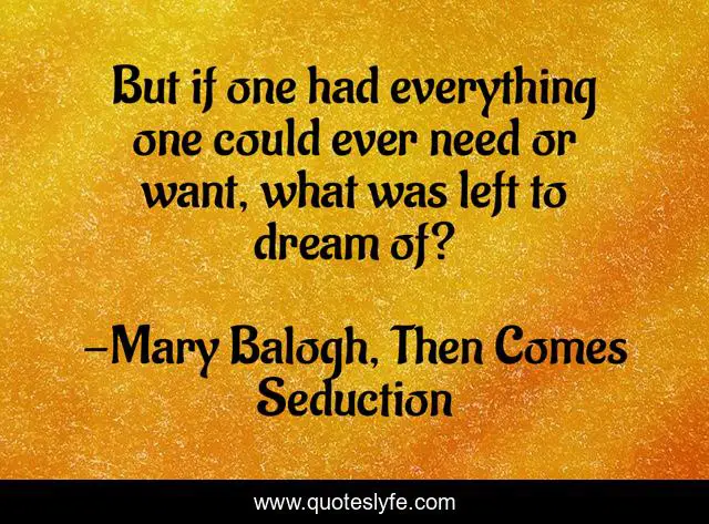 This page presents the quote "But if one had everything one could ever need or want, what was left to dream of?". Author of this quote is Mary Balogh, Then Comes Seduction. This quote is about need, dream,.