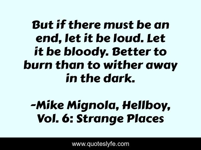 This page presents the quote "But if there must be an end, let it be loud. Let it be bloody. Better to burn than to wither away in the dark.". Author of this quote is Mike Mignola, Hellboy, Vol. 6: Strange Places. This quote is about end, end-of-the-world,.