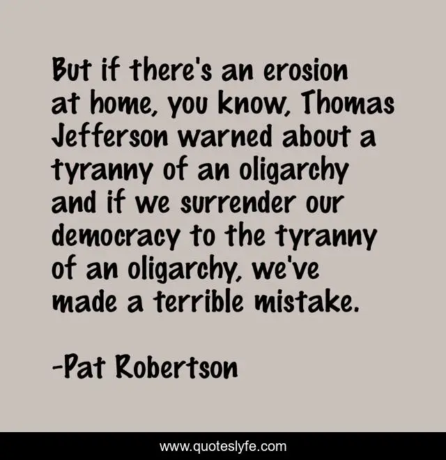 This page presents the quote "But if there's an erosion at home, you know, Thomas Jefferson warned about a tyranny of an oligarchy and if we surrender our democracy to the tyranny of an oligarchy, we've made a terrible mistake.". Author of this quote is Pat Robertson. This quote is about democracy, mistake,.
